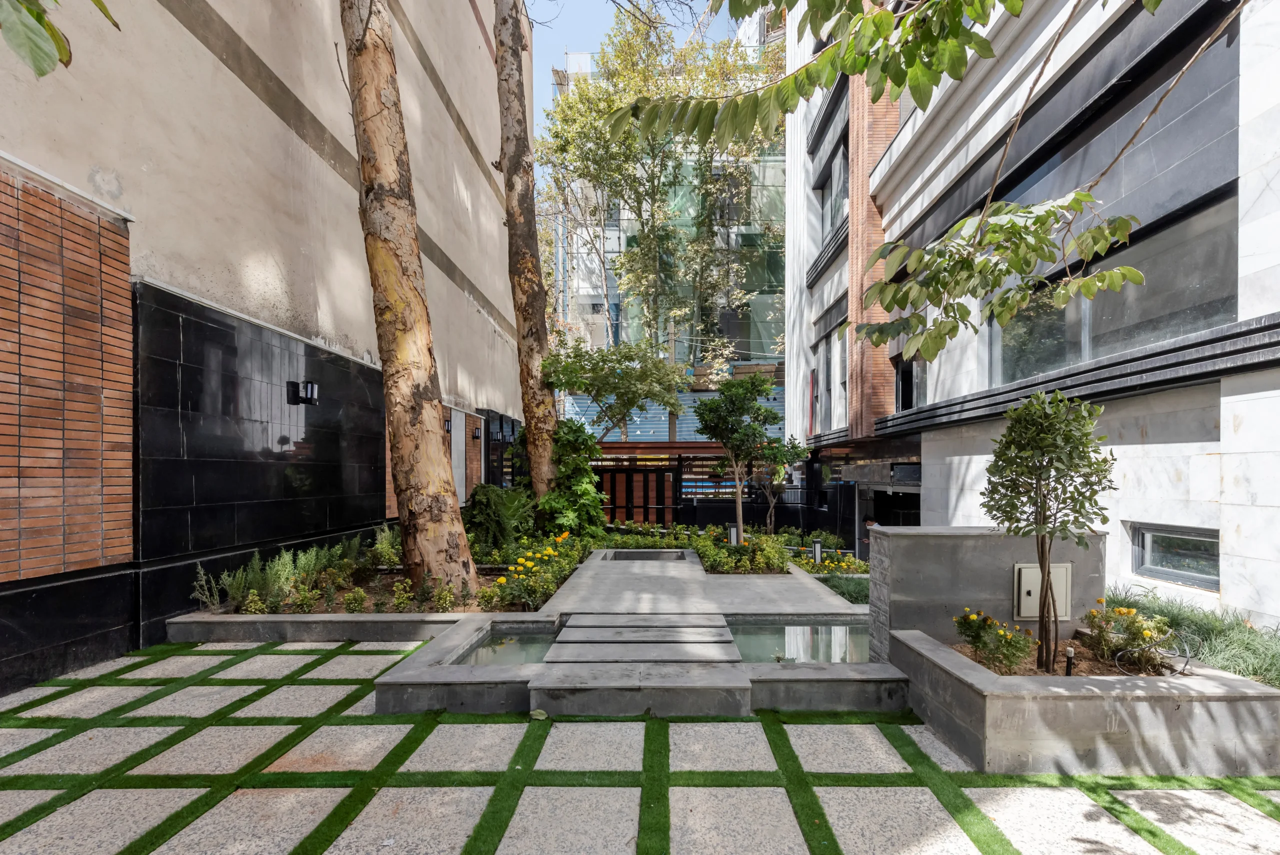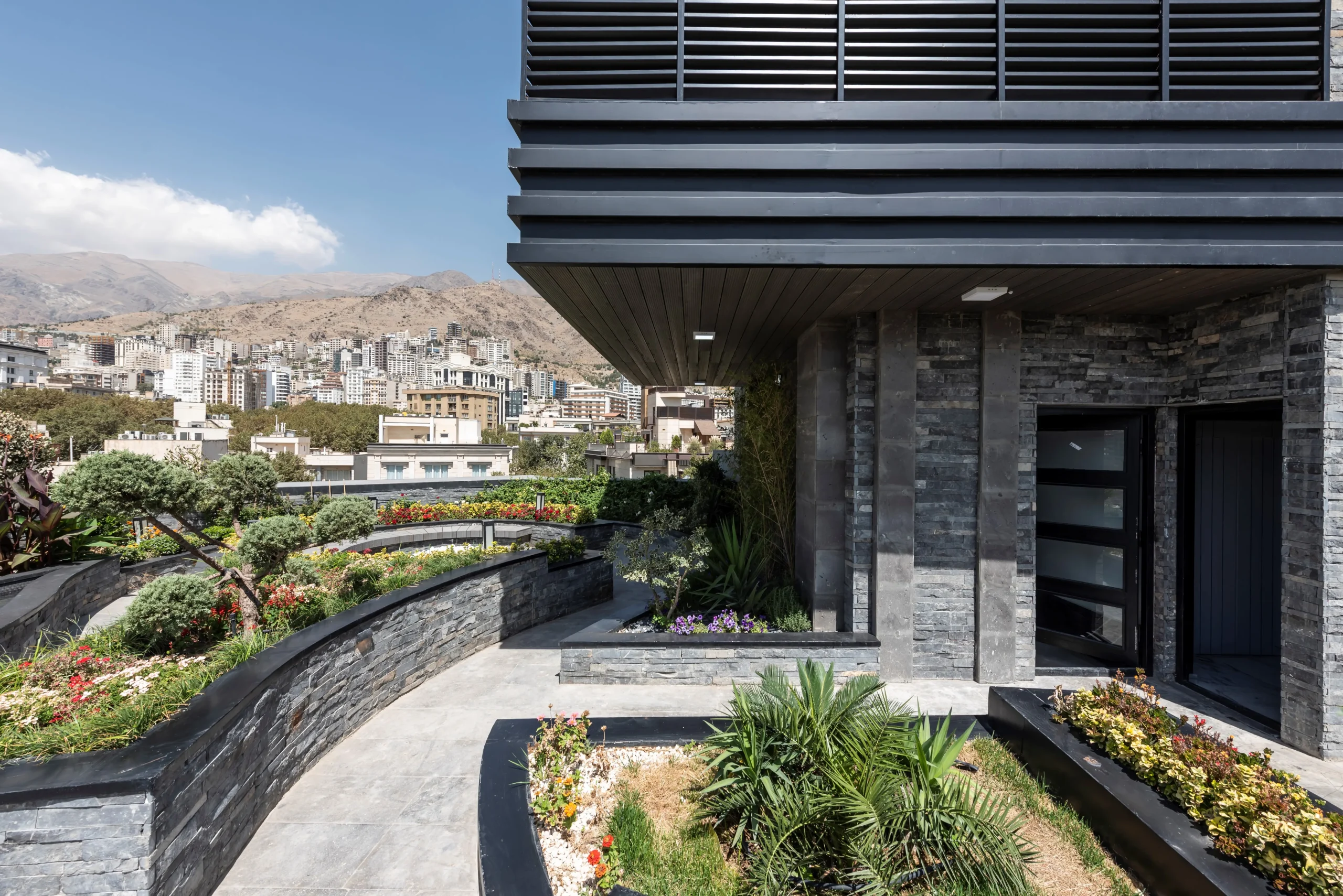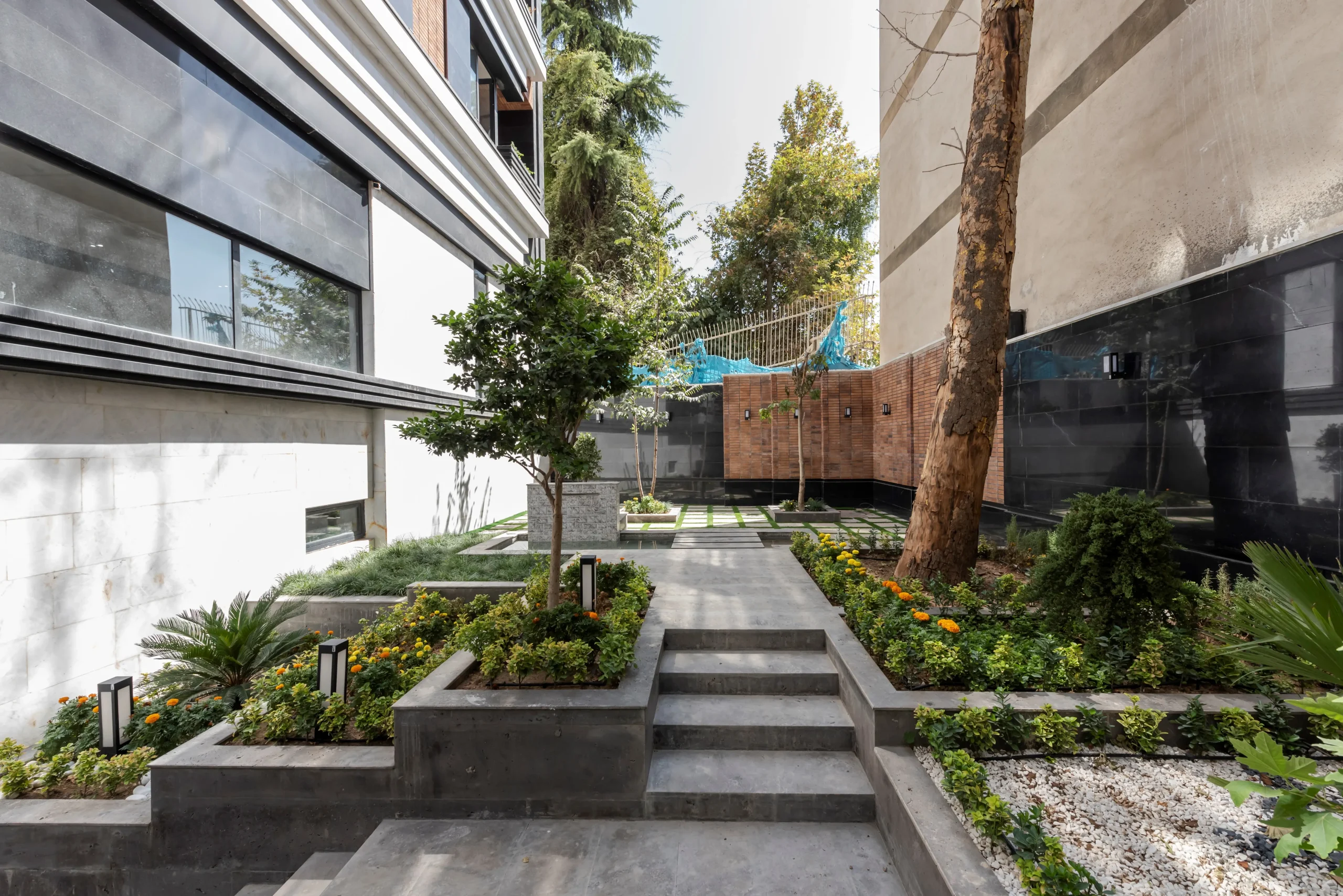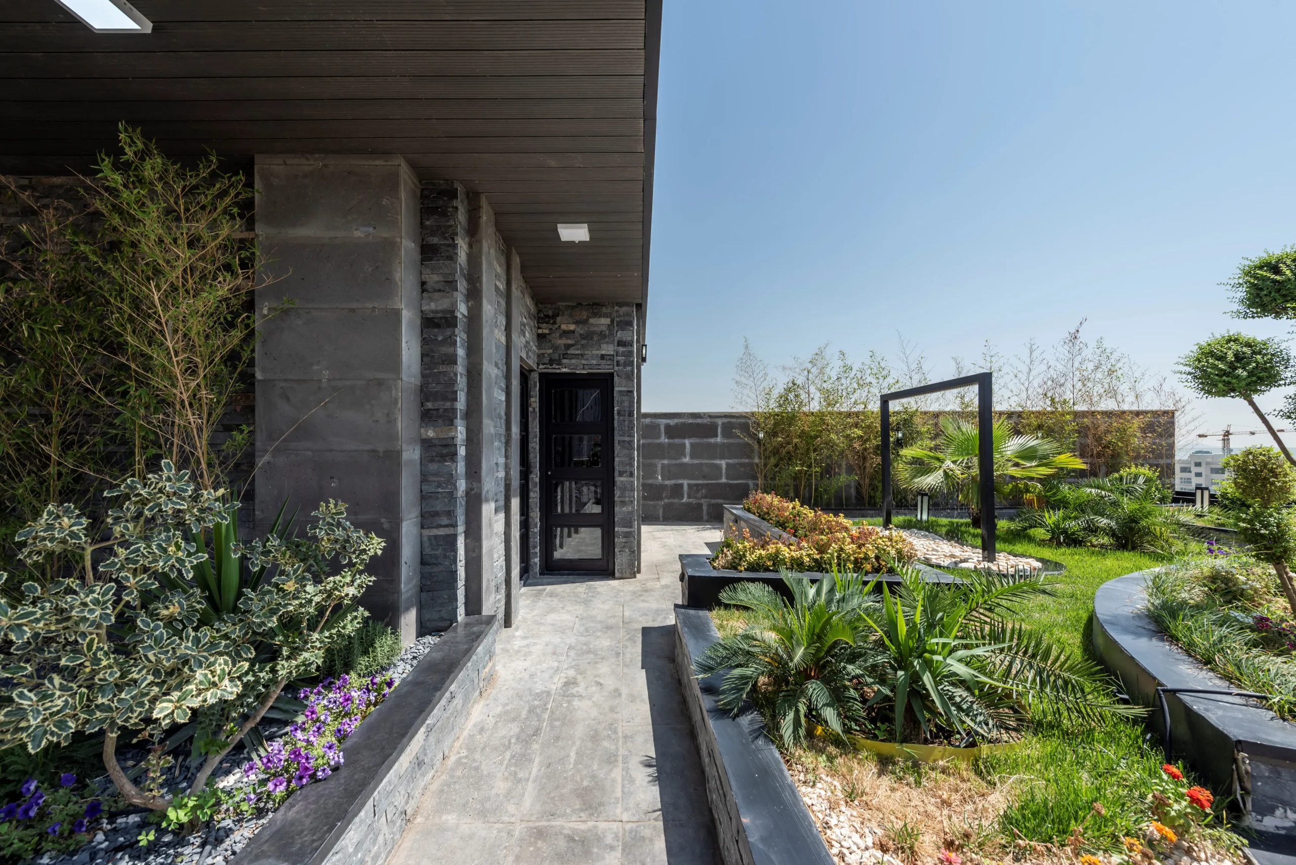 در طراحی این پروژه توجه بسیار بر تامین فضای سبز و ایجاد محیطی دلنشین و باطراوت برای ساکنین شده است لذا جهت تحقق این امر در بخش روف گاردن فضاهایی از جمله باغ ژاپنی ، آلاچیق ، آتشگاه  و آب نما در نظر گرفته شده است . بجز روف گاردن که دارای انواع گیاهان و درختچه های زینتی می باشد در سایر فضا ها از جمله استخر و  تراس طبقات  (‌ با تعبیه سیستم آبیاری قطره ای  بصورت هوشمند )‌  و همینطور حیاط ساختمان از انواع گیاهان و درختان استفاده شده است که این میزان فضای سبز در محیط آپارتمانی، آرامش و سرزندگی را برای ساکنین آن به ارمغان آورده است.