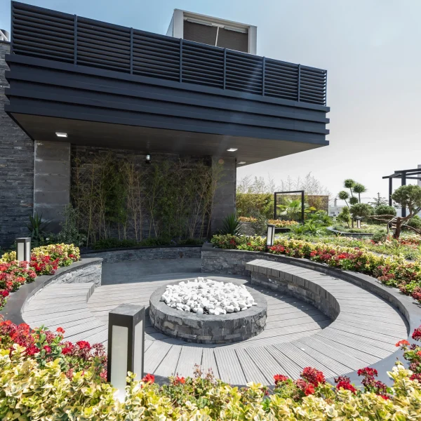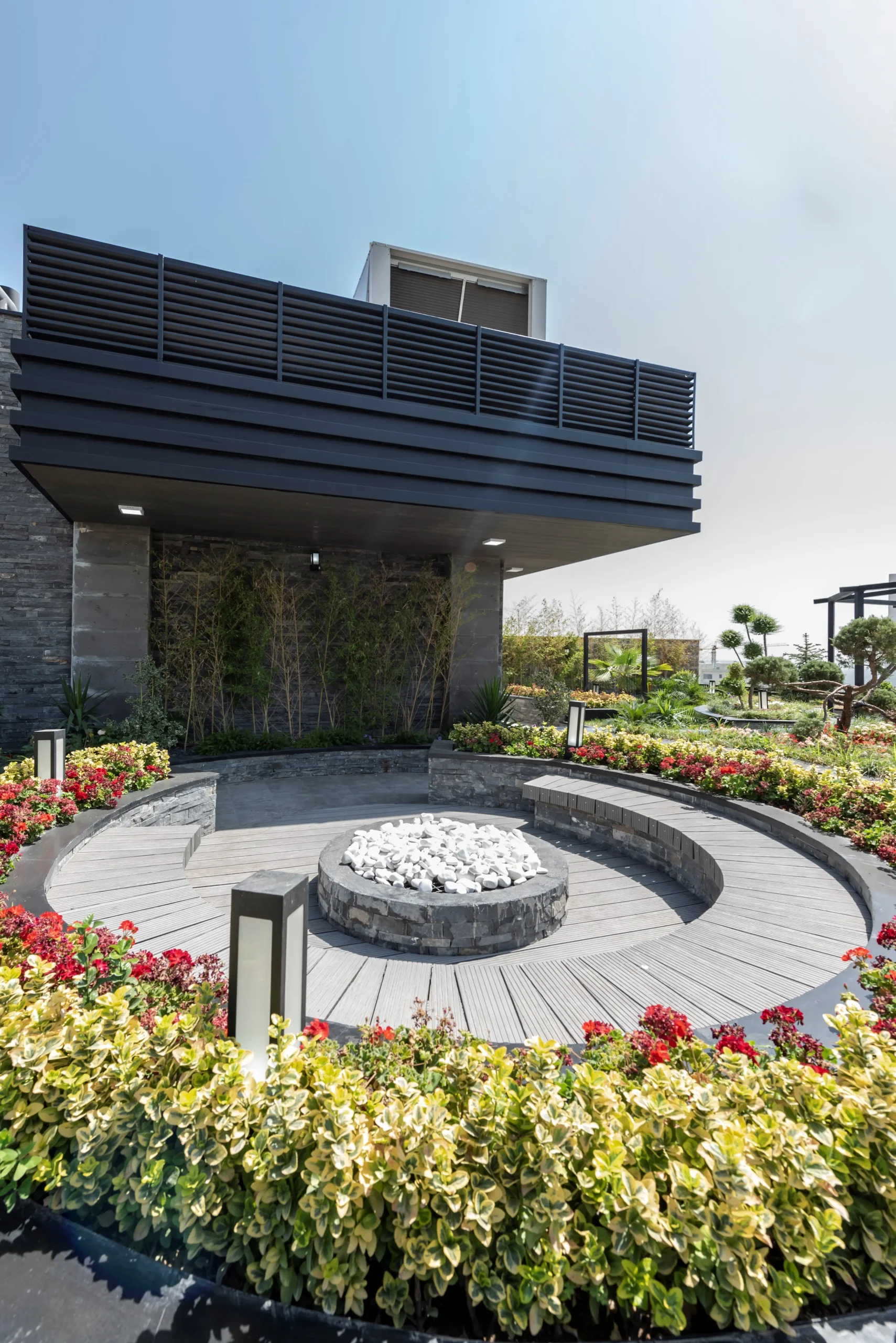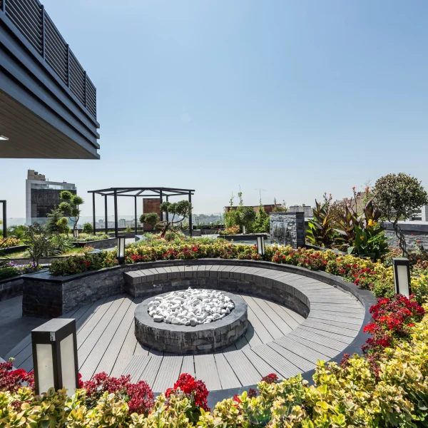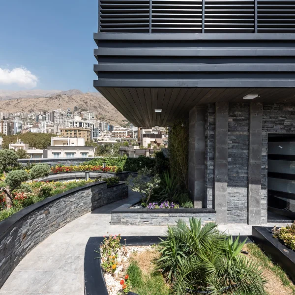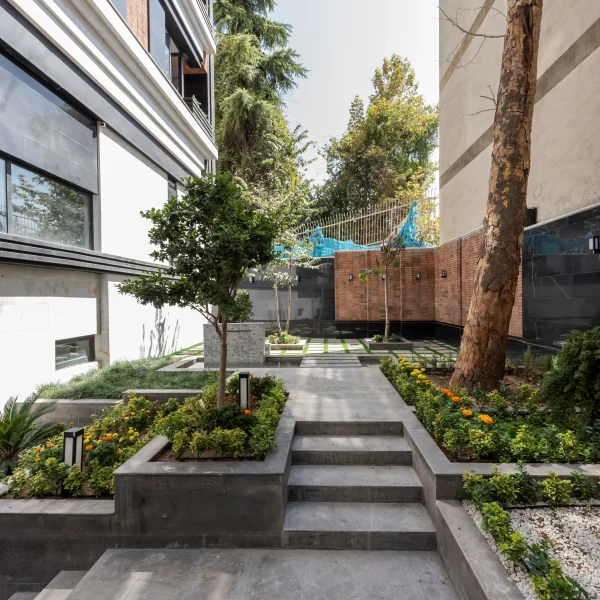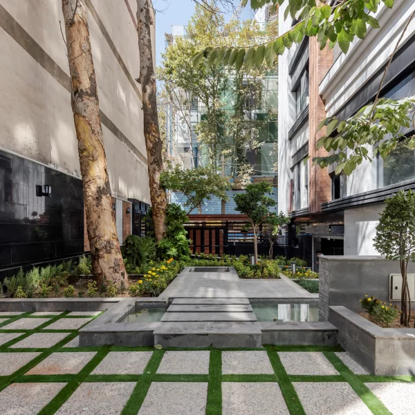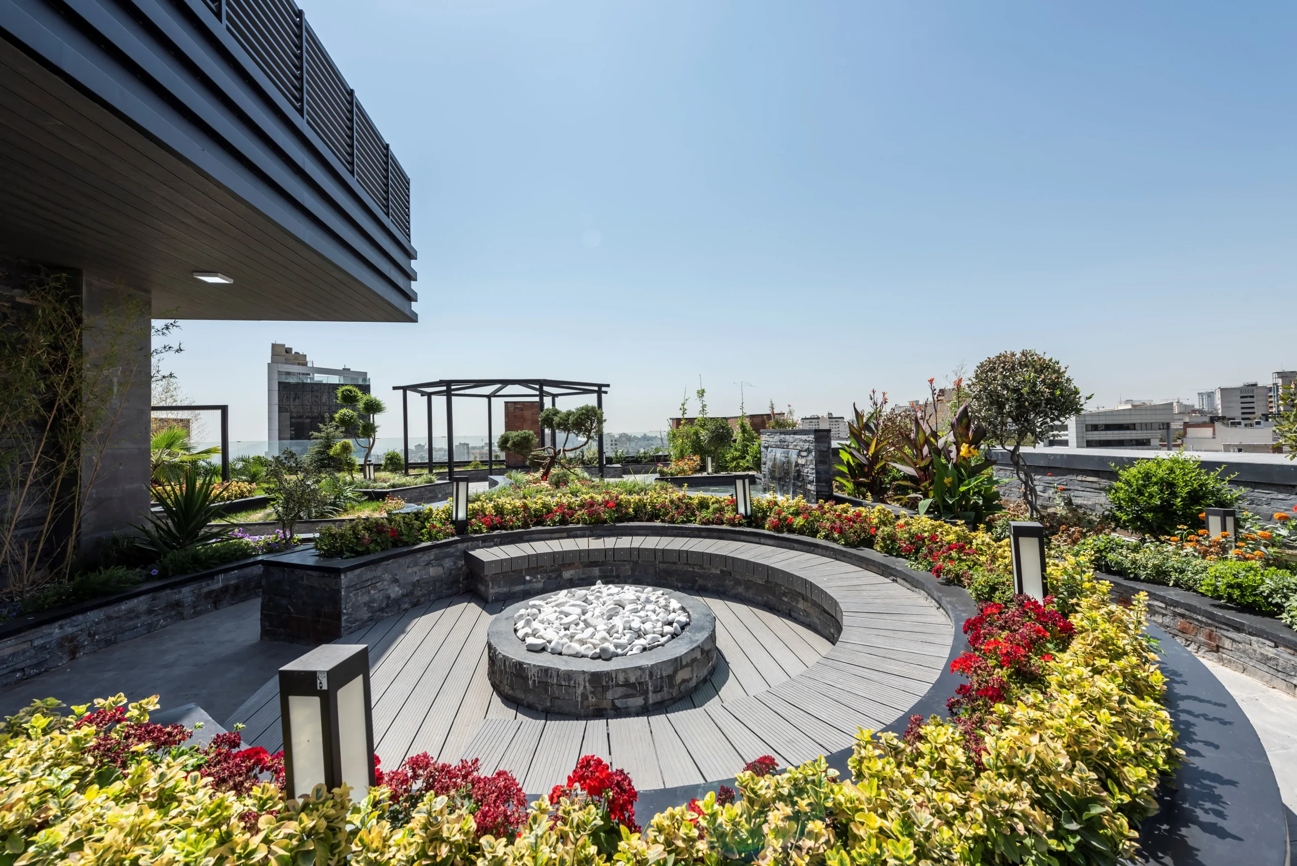 در طراحی این پروژه توجه بسیار بر تامین فضای سبز و ایجاد محیطی دلنشین و باطراوت برای ساکنین شده است لذا جهت تحقق این امر در بخش روف گاردن فضاهایی از جمله باغ ژاپنی ، آلاچیق ، آتشگاه  و آب نما در نظر گرفته شده است . بجز روف گاردن که دارای انواع گیاهان و درختچه های زینتی می باشد در سایر فضا ها از جمله استخر و  تراس طبقات  (‌ با تعبیه سیستم آبیاری قطره ای  بصورت هوشمند )‌  و همینطور حیاط ساختمان از انواع گیاهان و درختان استفاده شده است که این میزان فضای سبز در محیط آپارتمانی، آرامش و سرزندگی را برای ساکنین آن به ارمغان آورده است.